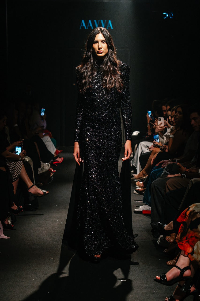 | High Neck back less Long Sleeves Sequence fitted bodice and a flowing skirt, embellished with 4 layers design making a long shawl creates a pearl loops |